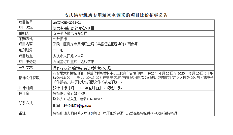 安慶港華機(jī)房專用精密空調(diào)采購項(xiàng)目比價(jià)招標(biāo)公告