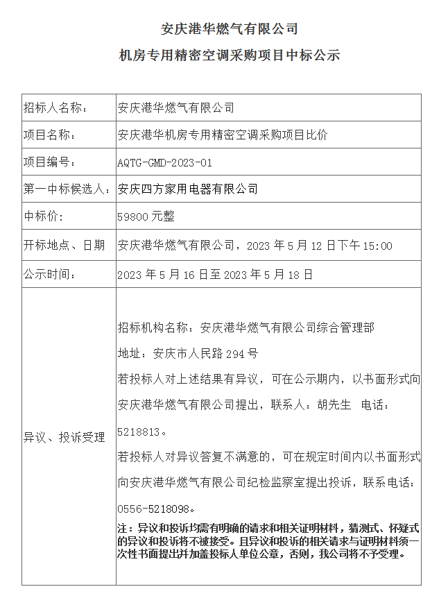安慶港華燃?xì)庥邢薰緳C(jī)房專(zhuān)用精密空調(diào)采購(gòu)項(xiàng)目中標(biāo)公示