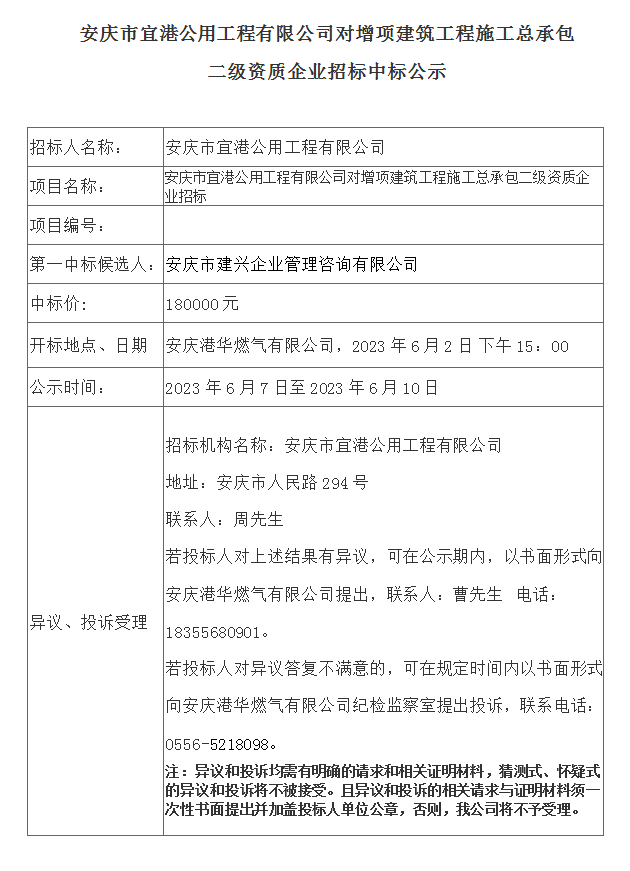 安慶市宜港公用工程有限公司對增項建筑工程施工總承包二級資質(zhì)企業(yè)招標(biāo)中標(biāo)公示
