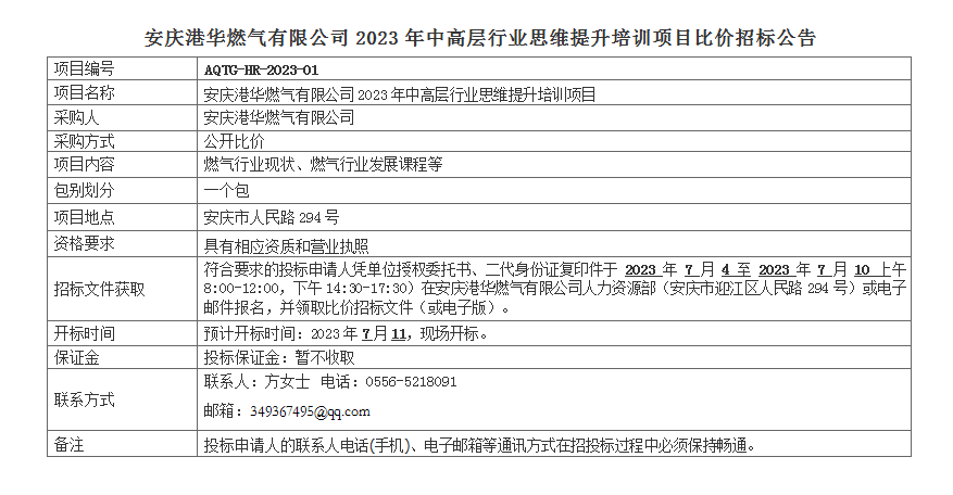 安慶港華燃氣有限公司2023年中高層行業(yè)思維提升培訓項目比價招標公告