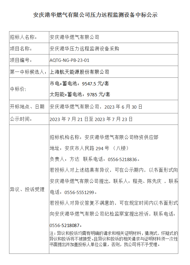 安慶港華燃氣有限公司壓力遠程監(jiān)測設(shè)備中標公示