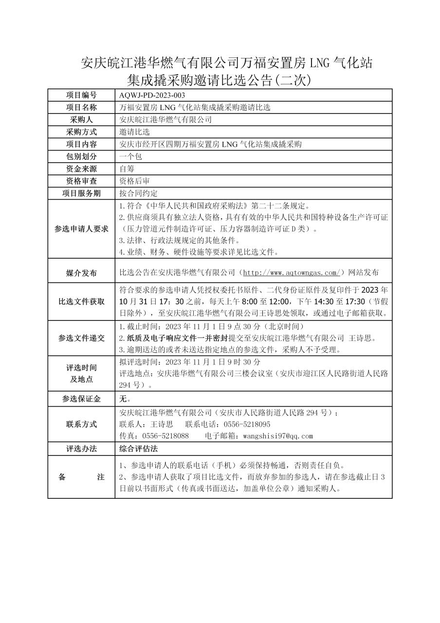安慶皖江港華燃氣有限公司萬福安置房LNG氣化站集成撬采購邀請比選公告(二次)
