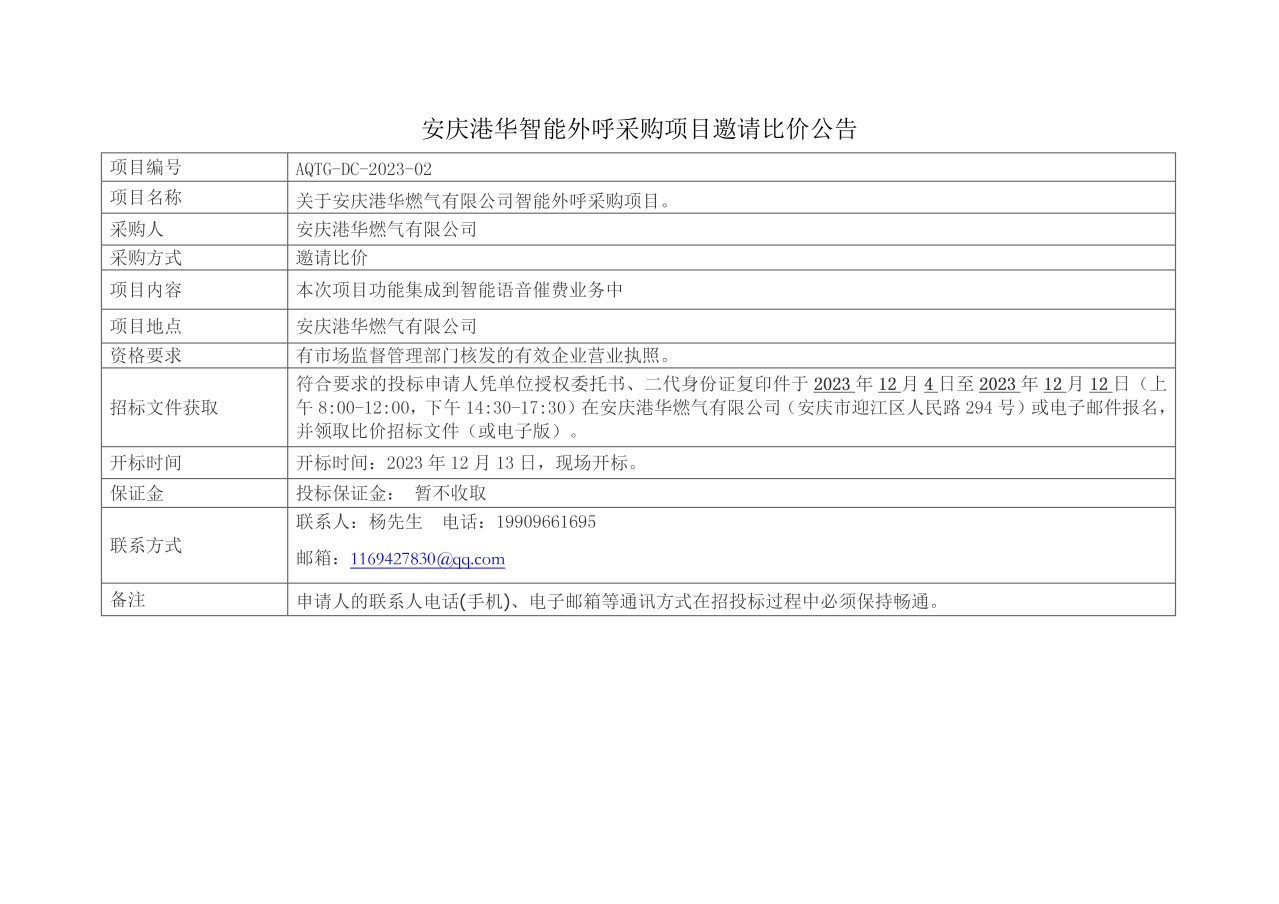 安慶港華燃氣有限公司智能外呼采購項目邀請比價公告