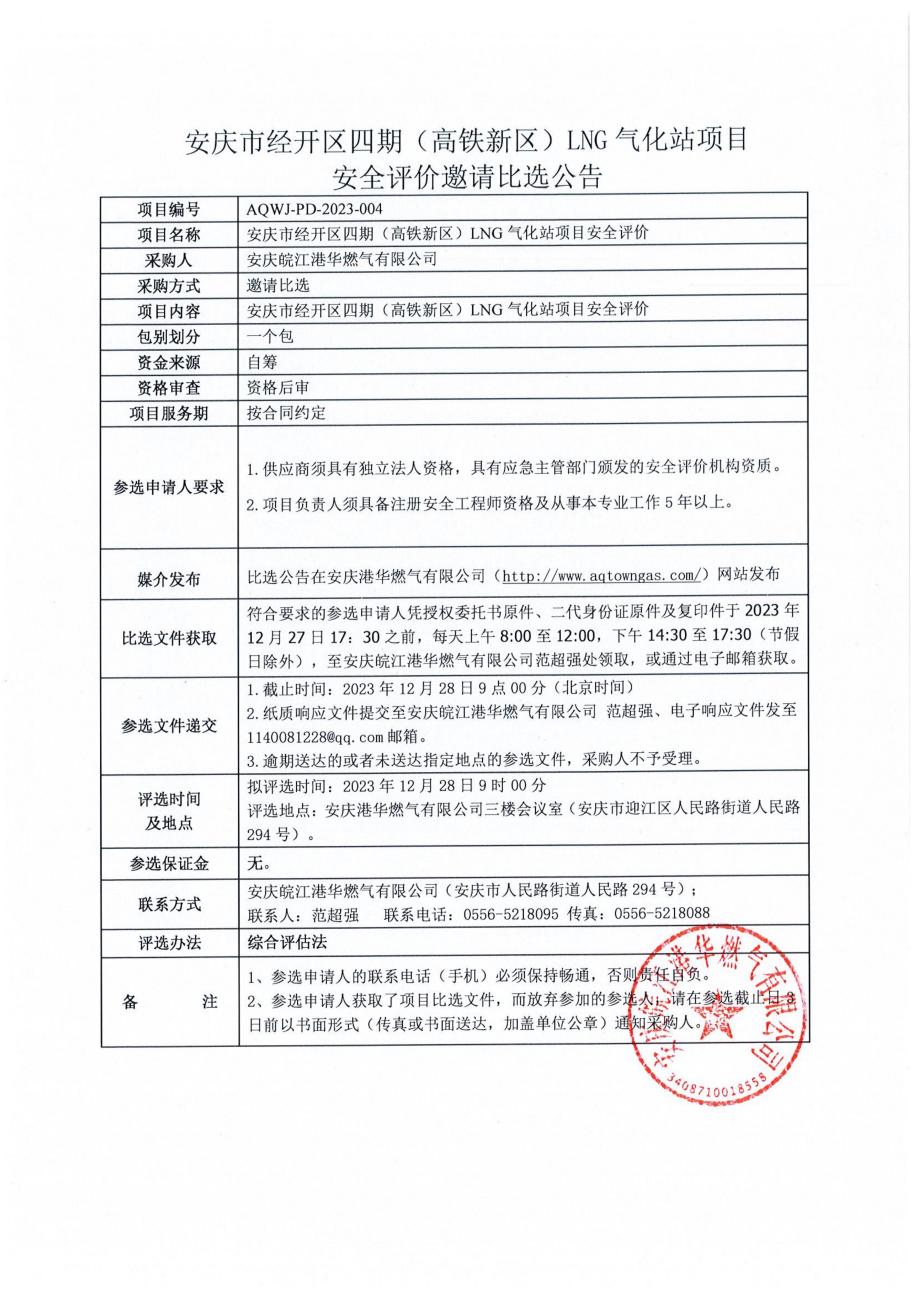 安慶經(jīng)開(kāi)區(qū)四期(高鐵新區(qū))LNG氣化站安全評(píng)價(jià)邀請(qǐng)比選文件