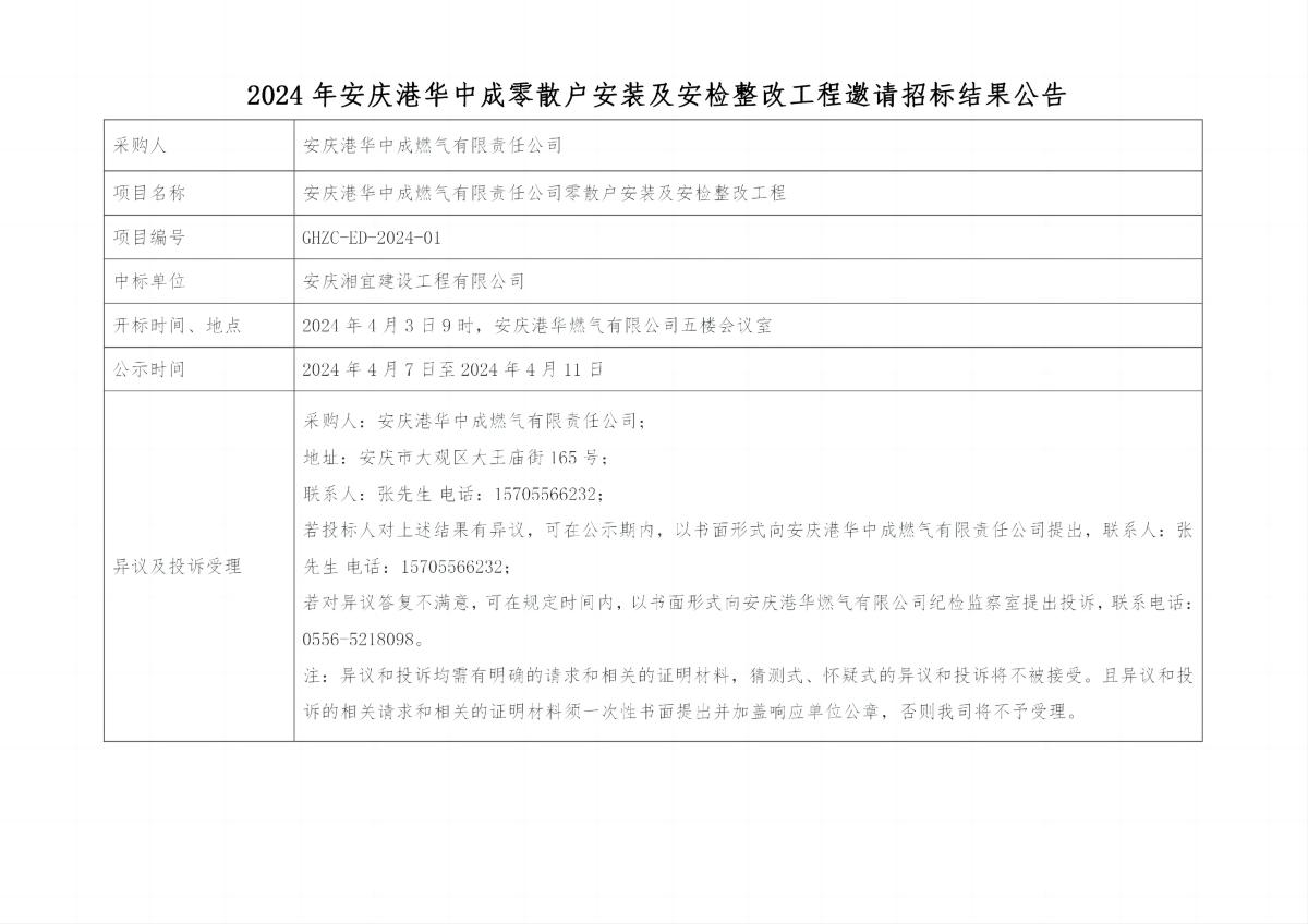 2024年安慶港華中成零散戶安裝及安檢整改工程邀請招標(biāo)結(jié)果公告