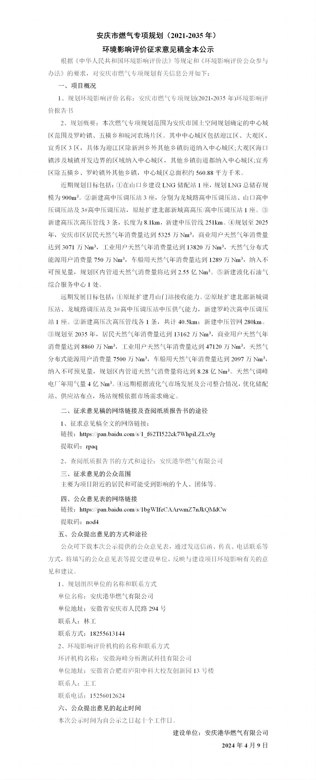 安慶市燃氣專項規(guī)劃(2021-2035年)環(huán)境影響評價征求意見稿全本公示