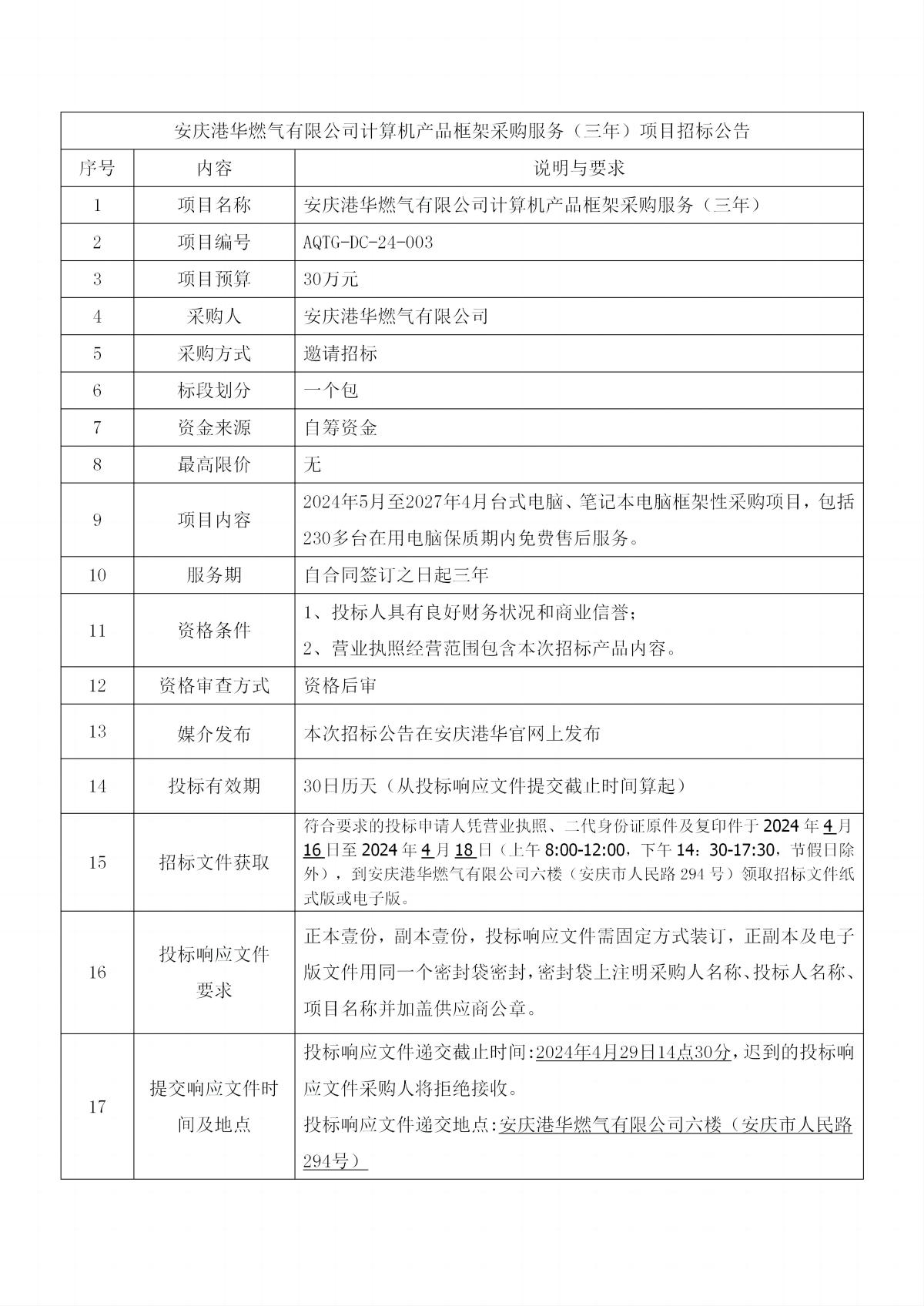 安慶港華燃氣有限公司計算機產品框架采購服務(三年)項目招標公告
