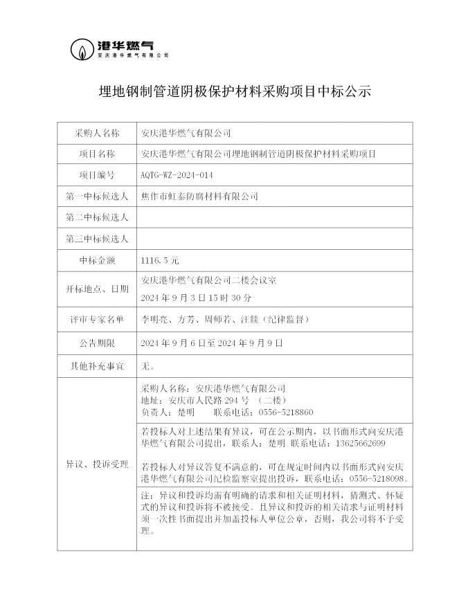 安慶港華燃?xì)庥邢薰韭竦劁撝乒艿狸帢O保護材料采購項目中標(biāo)公示