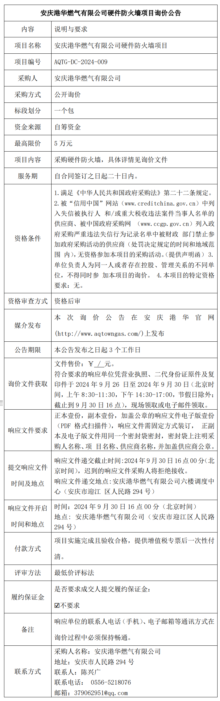 安慶港華燃?xì)庥邢薰居布阑饓椖吭儍r公告