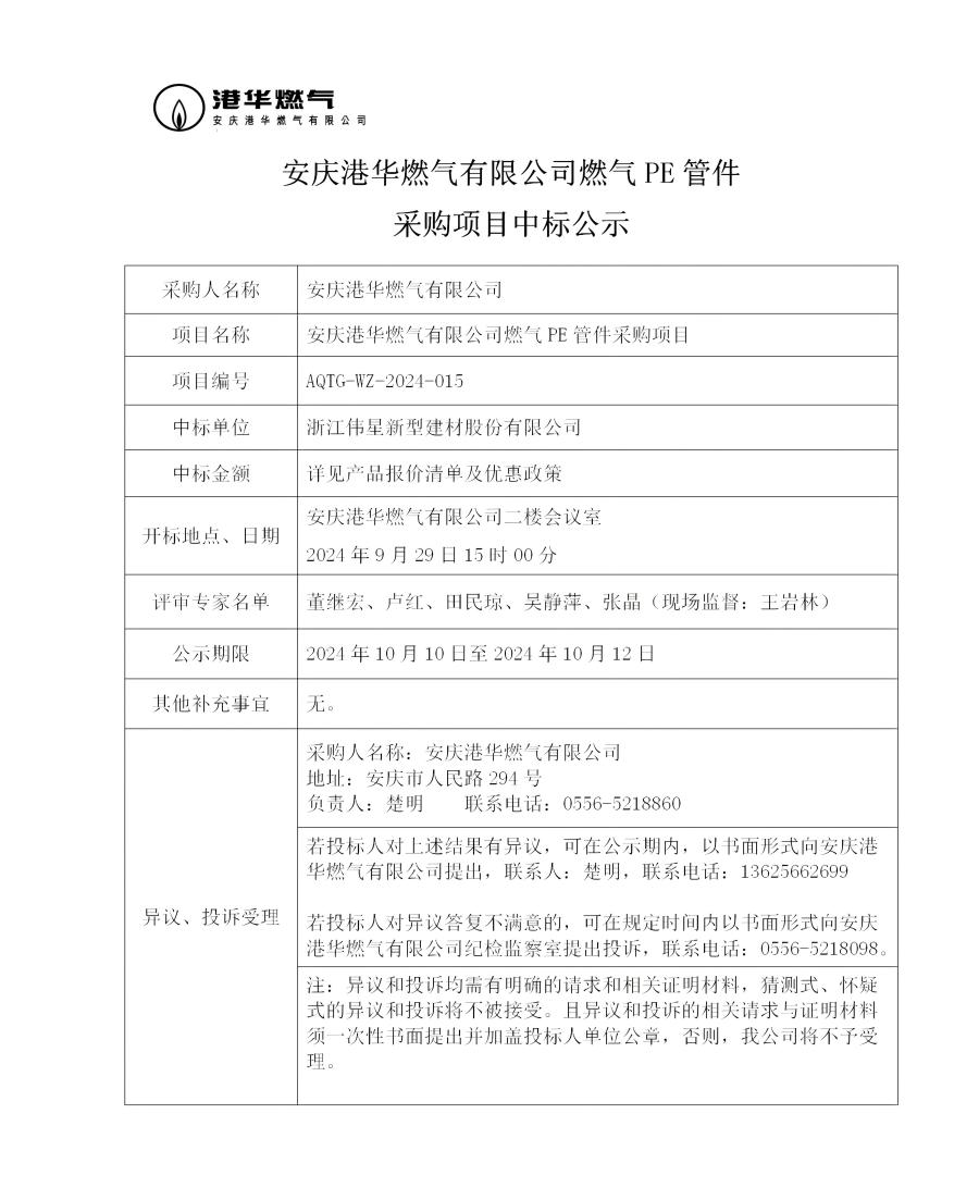 安慶港華燃氣有限公司燃氣PE管件采購項目中標公示