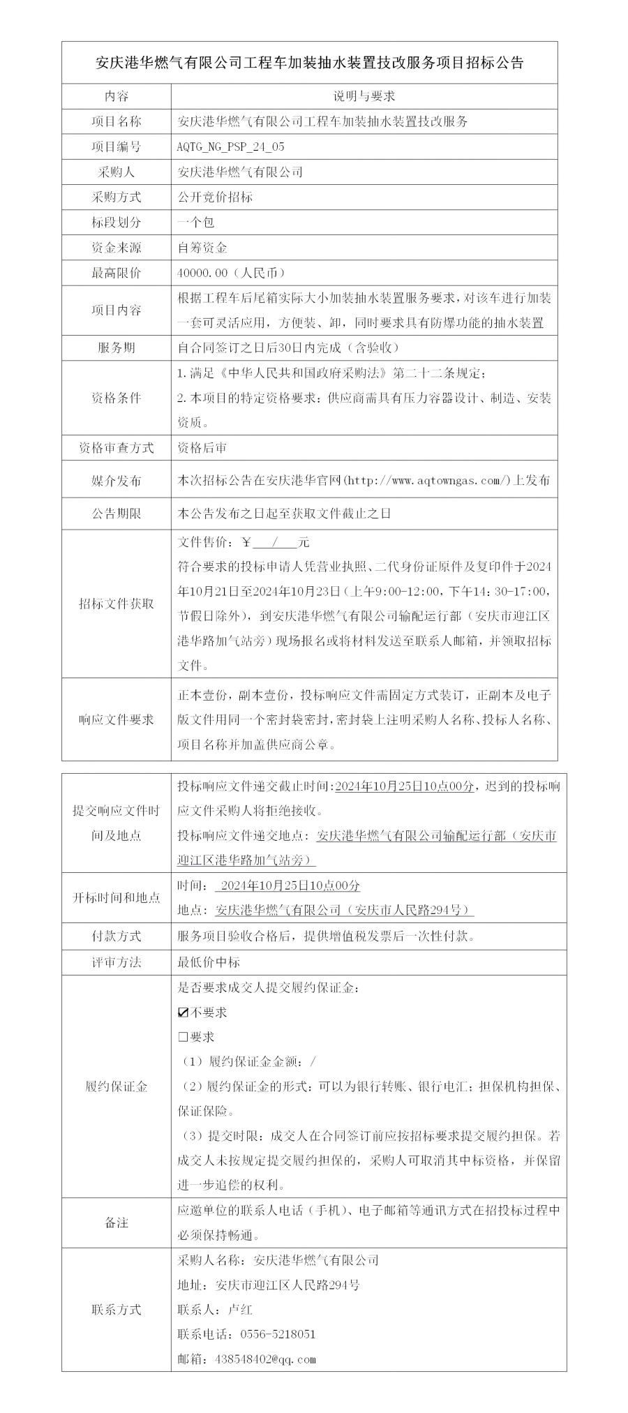 安慶港華燃氣有限公司工程車加裝抽水裝置技改服務項目招標公告