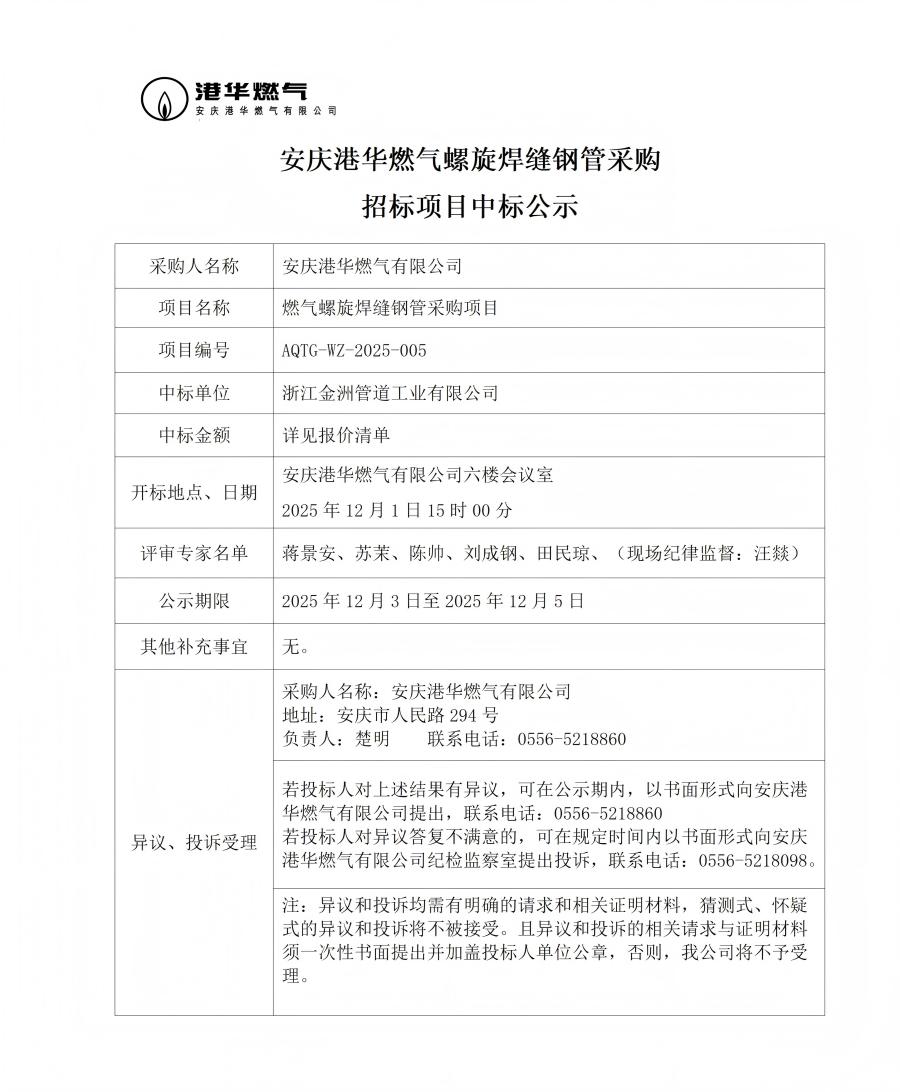 安慶港華燃?xì)饴菪缚p鋼管采購(gòu)招標(biāo)項(xiàng)目中標(biāo)公示