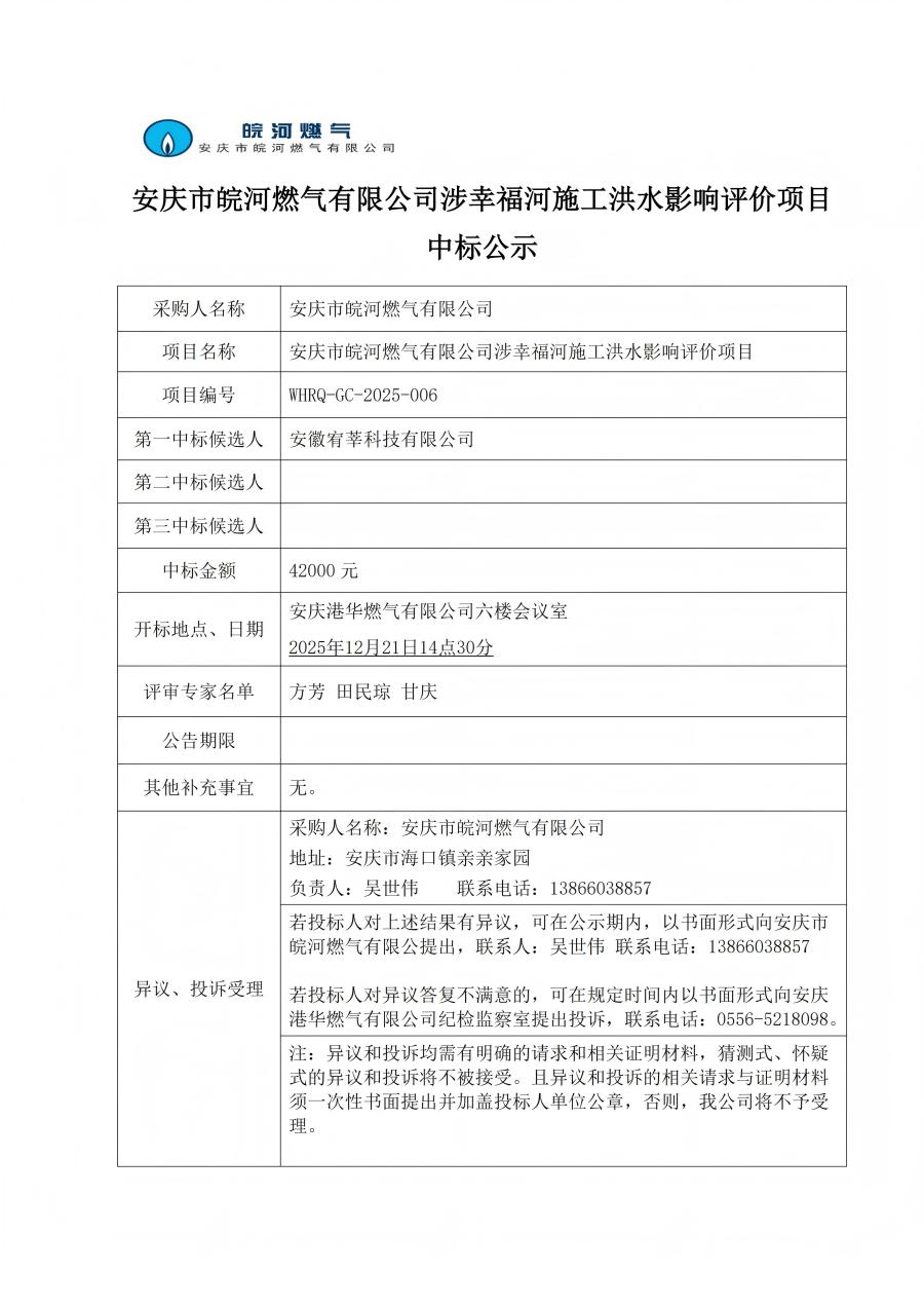 安慶市皖河燃氣有限公司涉幸福河施工洪水影響評價項目中標公示